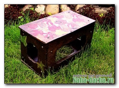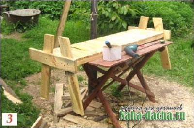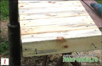 Спинка и сиденьеДля сборки используем саморезы 3,5x35. Предварительно просверливаем крепежные отверстия в поперечных досках спинки и сиденья сверлом d 3,5 мм. Для надежности конструкции п каждой доске, с обеих сторон, проделываем 2 ряда отверстий диагонально по отношению друг к другу
