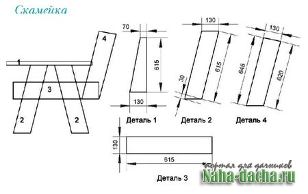 Из доски шириной 130 мм и толщиной 30 мм вырезаем заготовки для боковых стоек скамейки: подлокотники (2 шт.), ножки (4 шт.), боковины сиденья (2 шт.), боковины спинки (2 шт.) по схеме.