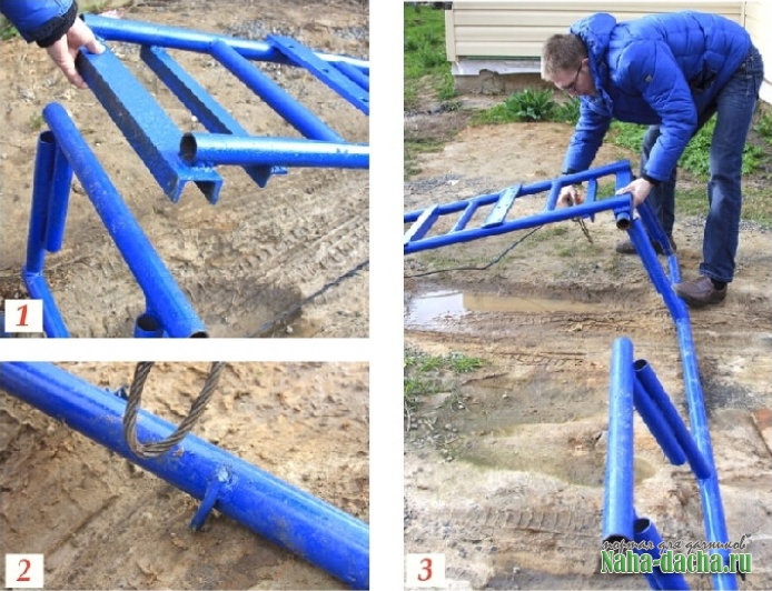 Остатки трубы d 50 мм распилил на куски, изготовил из них прямоугольные стойки под трапы (фото 1). Горизонтальные перекладины сделал шире лестниц, чтобы их можно было свободно передвигать, исходя из размера машины. Обе стойки припарил к трубе длиной 220 см. Внизу каждой из стоек, посередине, на трубе сделал металлические крючки (фото 2). На концы трапа, опирающиеся на землю, приварил кронштейны, на которые жестко закрепил с помощью болтов два троса.