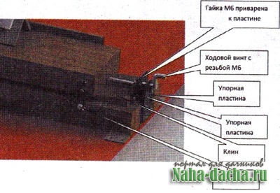 Чтобы избежать повреждения абразивного инструмента при касании детали, опускаю его на глубину не более 10 мк. Для поднятия верхней плиты использую подъемное клиновое устройство, состоящее из клина, упорных пластин и ходового винта. При вращении рукояткой ходового винта влево-вправо клин перемещается, и верхняя плита поднимается либо опускается.