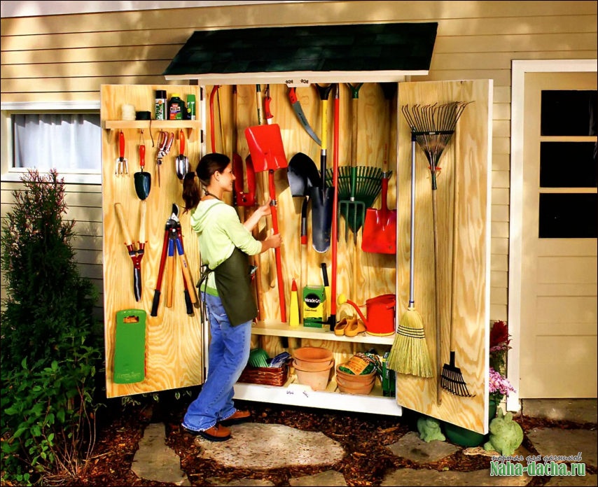 Строго говоря, целый дом граблям не нужен. Они вполне обойдутся узким шкафом на стене того же гаража, только снаружи. Отличная идея! Чтобы достать нужный инструмент, не придется заходить внутрь, делать лишние движения. Да и грязи в помещении будет значительно меньше, а порядка больше.