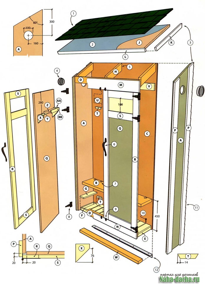 Габариты шкафа 1,2 х 2,3 м. Несмотря на свою компактность, он вместит не только садовые принадлежности, но и рабочую обувь, удобрения и разные мелочи, если оборудовать его с умом. Основной материал — влагостойкая фанера и сосновая доска. Мягкая черепица защитит от дождя. И если влага все-таки попадет внутрь, то не застоится и не навредит. Решетчатый пол и расположенные под крышей круглые отверстия обеспечат хорошую вентиляцию.