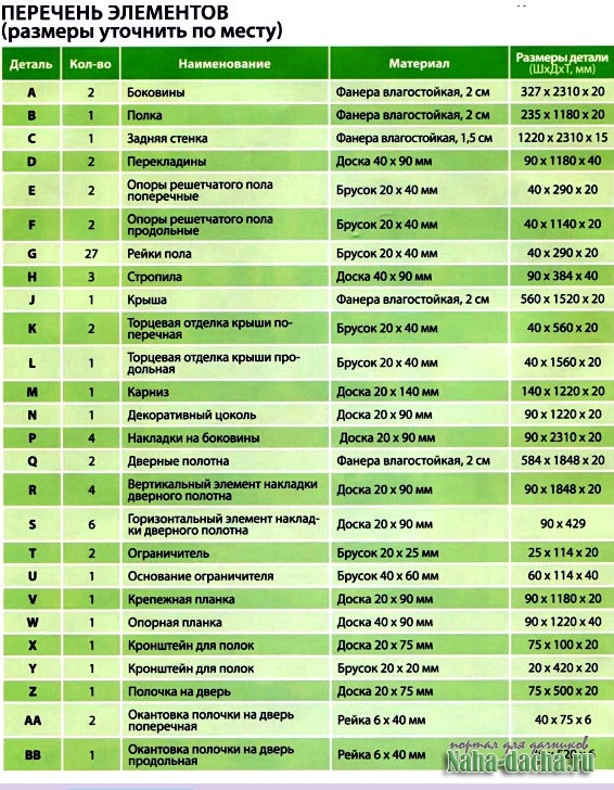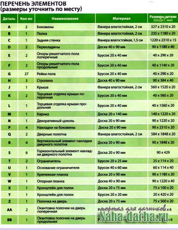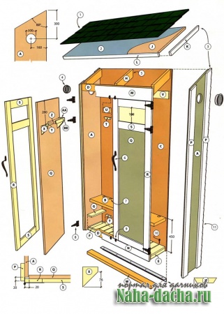Можно сразу заготовить все детали дома-шкафа, кроме элементов фальшобвязки дверного полотна и отделки (их лучше выполнять по размерам уже готового короба). Самый ровный лист фанеры используйте на дверцы. Старайтесь раскроить материал так, чтобы лучшие участки фанеры пошли на те детали, которые вы планируете покрасить. Боковины (на схеме у нас они обозначены литерой А) имеют скос под крышу. Соответственно, и стропила (Н) придется срезать. Вспомните школьные уроки геометрии, воспользуйтесь транспортиром. Отверстия под шурупы сверлите зенковкой №8 и насадкой-фрезой. Полки на боковинах, перекладины верхней и нижней обвязки (D) крепите оцинкованными шурупами длиной 50 мм, а заднюю стенку — 40 мм. Для стропил используйте длинные, 75 мм. Добрый совет: под реечный пол подложите кусок оцинкованной стальной сетки с мелкими ячейками, она предохранит ваш шкаф от мелкой живности.