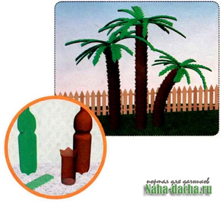 Оформили каждый пальмовый «лист», сделав с обеих его сторон 2-сантиметровые надрезы под углом. Зажигалкой опалили бахрому - она чуть загнулась,. Надели на верх прута горлышко первой, самой большой бутылки, а затем остальные. Сверху зафиксировали «листья» на арматуре с помощью проволоки с зеленой обмоткой.