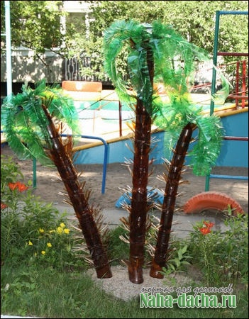 Сын воткнул в землю арматуру длиной 2 м, оставив над уровнем почвы 170 см. Я нанизала на эту основу бутылки вниз горлышком, вставляя одну в другую. Получился «ствол» пальмы.
