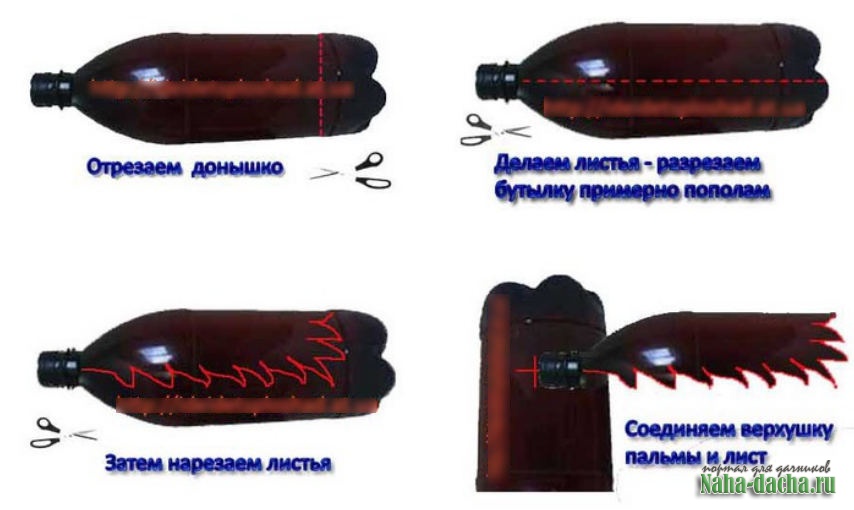 После этого мы взяли 5 зеленых бутылок емкостью 2-2,5 л. От каждой также отрезали донышки, а затем разрезали вдоль до горлышка на 3 части. Получившиеся «листья» пальмы ножницами закруглили. Перевернули заготовки.