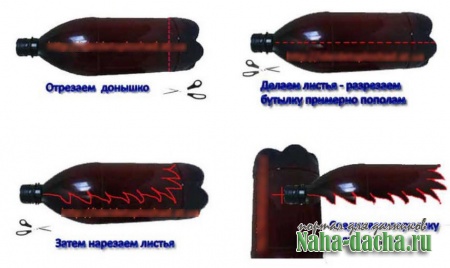 Я и мой сын с помощью бутылок решили превратить уголок участка в «средиземноморский остров», украшающий дачу даже зимой. Взяли 15 пластиковых 2-литровых бутылок из-под кваса, ножницами отрезали у них донышки с бортиками высотой 5 см (выбрасывать донышки не нужно).
