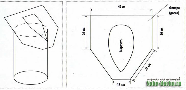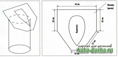 Есть выход: импровизированный унитаз. Обычный дачный туалет выглядит как? Дыра в полу. А можно на эту дыру водрузить отслужившую двухведерную бочку (кастрюлю, бадью) без дна, и получатся «стенки». Затем вырезаем из многослойной фанеры нехитрое приспособление, как у настоящего унитаза. Кладем его на бадью. А сверху - такое же по форме, но вырезанное уже из пенопласта -это для мягкости и тепла зимой. А вот самую тонкую деталь, такой же формы, как и две первые, можно сделать из того, на что фантазии хватит. Замечу: картонная имеет то преимущество, что ее можно часто менять. Кстати, если оставить образец («выкройку»), в дальнейшем останется только обводить и вырезать, уже не тратя время на «чертежи».