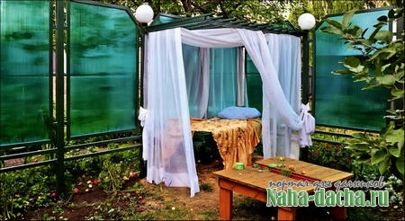 8. В одном из ваших журналов я прочла статью про фэншуй в саду. А почему нет! Соотнесла зоны фэншуй со своим садом и поняла, что, интуитивно размещая здесь место отдыха и оформляя его, я действовала правильно. Это зона отношений, романтики... На козырек повесила белоснежную вуаль, которая легко снимается. Изумрудный газон, деревянный столик, свечи, аромат яблок — поверьте, это лучшее место на земле!