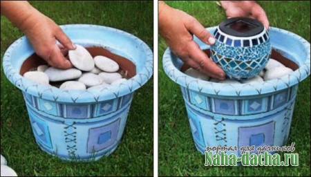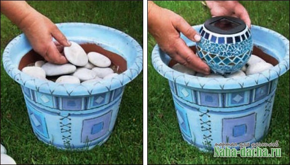 светильник из горшка 4. Насыпьте в контейнер песок. Поверх него красиво разложите гравий или крупную гальку.