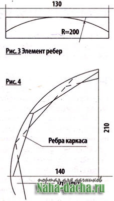 (рис. 4) 4 элемента ребра. Сколачиваем ребра каркаса, положив каждый элемент на половину длины следующего, и ровно по окружности. Забиваем не менее 6 гвоздей в каждое крепление длиной 60-70 мм с загибом с обратной стороны. Отпиливаем лишнюю древесину по сторонам прямого угла - эти части можно использовать для следующих ребер. Получаем 10 ребер каркаса