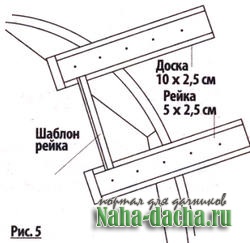 Рис. 5. Тетивы. Сколачиваем из досок 10x2,5 см и реек 5x2,5 см, прибивая их по центру доски по всей длине. Длина тетивы 565 см - на 20 см длиннее брусьев рамы-основания. Нужно 10 шт. тетивы.