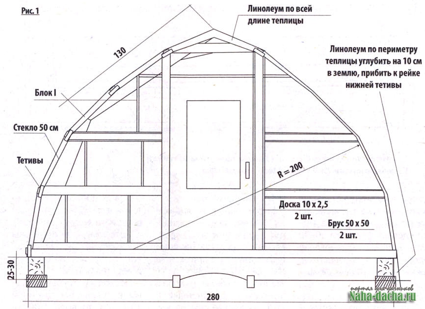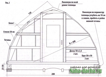 Предлагаемый проект теплицы довольно прост в изготовлении, долговечен и, что немаловажно, не требует особых материальных затрат. Теплицу отличают высокий уровень освещенности и взаимозаменяемость стекол по длине (если один из размеров любого стекла равен 50 см).