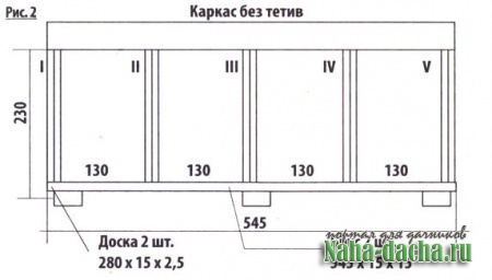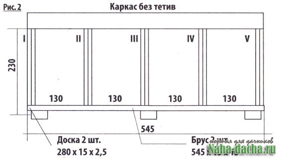 (рис. 1 ). По нему сколачиваем блоки II, III, IV (они одинаковые), соединив два ребра каркаса досками вверху на высоте 1,7 м. Блок V такой же, как блок I, но без двери.