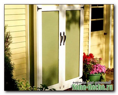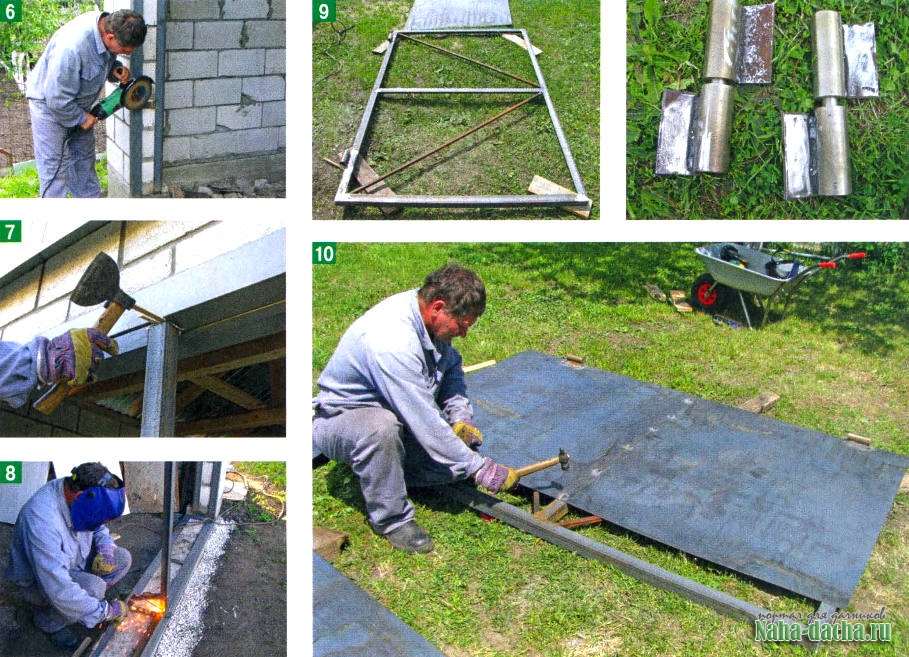 Готовую створку ворот установил на место. Правую створку сделал аналогично левой, только длину горизонтальных уголков выбрал с учётом 8-мм зазора на открывание створок. После навески ворот приварил к левой створке накладку из полосы металла, которая закрыла щель между створками. Затем сделал самодельные запоры для них. Ворота покрасил специальной краской по ржавчине. Важно, чтобы ворота плотно закрывались, и не было больших зазоров, через которые грызуны могли бы попасть внутрь гаража. Дверь в гараж со стороны участка делал аналогично воротам.
