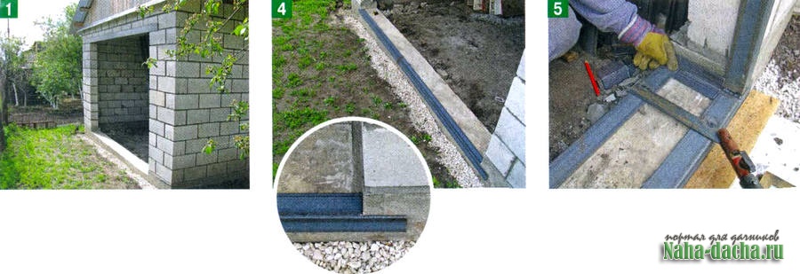 Нижние и боковые уголки каркаса расположил с наружной и внутренней сторон стены гаража. Начал с крепления нижних уголков. Для этого отпилил два уголка по ширине проёма с учётом последующей сварки с вертикальными уголками. Уложив уголки на порожек, временно прихватил их сваркой с помощью поперечных полос. Затем отрезал болгаркой и приварил четыре вертикальных уголка. Все уголки каркаса тщательно приварил друг к другу, используя соединительные уголки. После этого обработал сварные швы шлифовальным кругом.
