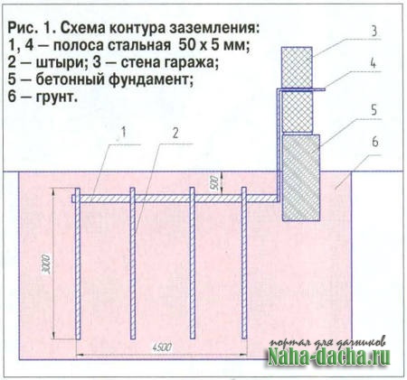 Для установки контура заземления прокопал траншею глубиной 0,5 м. В неё забил кувалдой четыре штыря на равном расстоянии друг от друга. Затем приварил полосу к штырям и завёл её в гараж. Замеры показали, что величина сопротивления заземляющего контура соответствует нормам. В дальнейшем к этому контуру заземления планирую подключить распределительный шкаф и электроприборы.