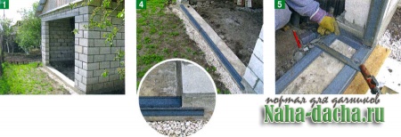 БЕТОННАЯ ОТМОСТКАОставалось сделать бетонную отмостку по периметру гаража. Сначала я отметил колышками границы отмостки и натянул верёвку. Затем снял грунт на штык лопаты. Установил опалубку из оставшихся досок. Засыпал песок со щебнем, всё утрамбовал. Уложил остатки арматуры, уголков, обрезков труб для армирования. Заливали бетон с сыном, используя нашу бетономешалку на 150 л. Залили довольно быстро — наверно, сказался предыдущий опыт по заливке фундамента. После заливки бетон укрыл полиэтиленом, чтобы он не пересыхал и лучше набирал крепость.