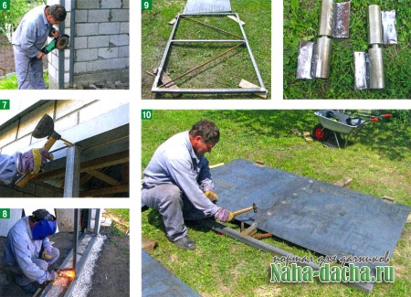 Стандартного листа металла не хватало для обшивки всей рамки створки, пришлось выкраивать с помощью болгарки необходимые куски. Сначала приварил к рамке верхние детали петель. Листовой металл фиксировал сваркой, предварительно выпилив в нём вырезы под ушки петель. Нижние части петель приварил к уголкам каркаса.