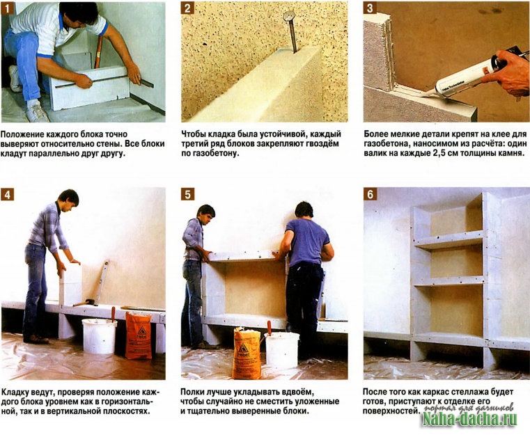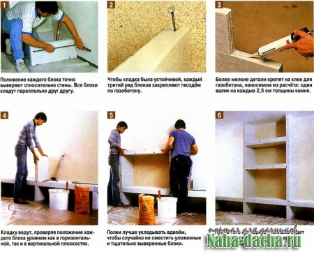 Тщательно разметив на полу положение первого ряда блоков и нанеся на стену, где это необходимо, с помощью отвеса и карандаша вертикальную линию, приступают к кладке стеллажа. На какой высоте и с каким шагом расположить полки, решаете вы сами.