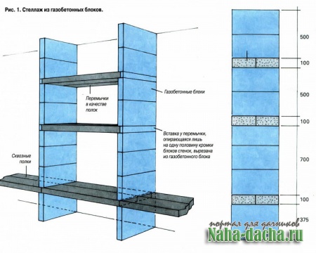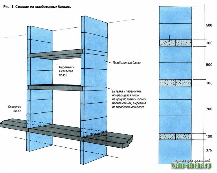 Стеллаж из газобетона Рис.1. При проектировании стеллажа надо учесть размер перемычек, прочность и свойства материала пола. Если газобетонные блоки можно раскроить по формату обычной ножовкой по дереву, то с перемычками, имеющими стандартные размеры, этого сделать нельзя, так как они армированы. Чтобы упростить кладку, следует использовать блоки одинаковой толщины.
