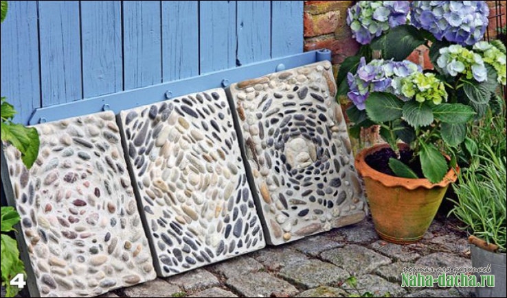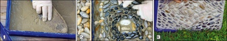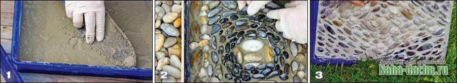 Для «пробы пера» лучше выбрать небольшую площадку и простой мотив. Выложите камешки на сухую смесь песка с цементом. Поверх готовой мозаики положите доску и надавите — чтобы настил получился ровным. Если нужно — подсыпьте песчано-цемент-ную смесь: камешки должны выступать из основы приблизительно на 5 см. Затем аккуратно полейте свой шедевр водой из распылителя. На поверхность изделия можно ступать уже после застывания смеси, однако на ближайшие две недели желательно прикрыть мозаику тентом для защиты от солнца и дождя. Дерзайте!
