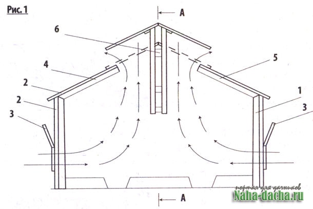 Многие жалуются на перегрев растений внутри сооружений (жара летом стала уж слишком частым явлением). Для защиты многие вынуждены использовать притене-ние в виде меловой побелки стен и крыш или укрывного материала, натянутого под сводами. Хорошие варианты, но оба требуют дополнительных затрат труда, времени и средств. В чем же выход? Видимо, в устройстве хорошей эффективной вентиляции, которая не только поддерживала бы равномерный температурный режим, но и обеспечивала достаточное проветривание помещения.