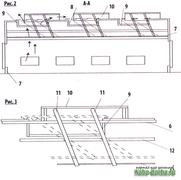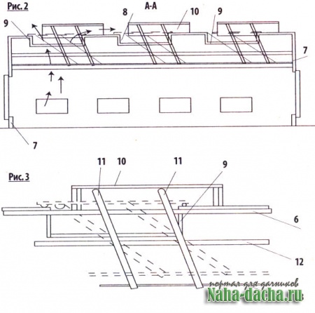 6,12 - балки коньковая и опорная; 8,9 - вентиляционный проем и его облицовка; 10 - коньковая фрамуга; 11 - планка; 13 - натяжной приводной трос