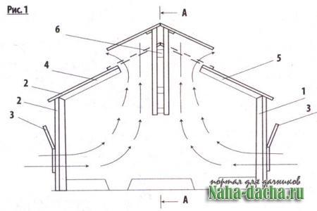 В результате возникла идея сделать вытяжные проемы не в скатах крыши, а непосредственно в коньке, по обе стороны от коньковой балки. Это наиболее оптимальное решение, так как именно туда устремляются потоки нагретого в теплице воздуха. Но как же закрывать эти проемы на ночь и при непогоде? А очень просто - фрамугами, имеющими такой же профиль, что и крыша, и опирающимися на ее скаты. По сути это и есть форточки.
