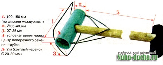 Два куска (по 45 см) упругой стальной проволоки диаметром не более 2 мм гнем в виде скоб по двум длинным сторонам пластиковой трубки, продеваем в пропаянные на торцах отверстия и забиваем загнутые концы в черенок. Режущую часть проволочной скобы загибаем таким образом, чтобы условная линия, соединяющая края двух режущих кромок, проходила по центру поперечного разреза обрезка трубы.