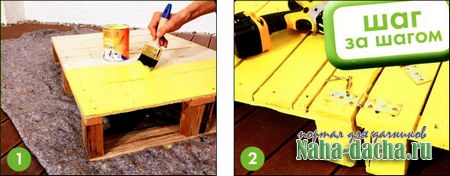 1. Перед окрашиванием деталей удалить или забить поглубже все торчащие гвозди, отшлифовать поверхности. После этого нанести защитную краску для дерева. 2. Когда краска высохнет, выполнить подвижное соединение спинки и сиденья с помощью трех карточных петель 128 x 40 мм, установив их с лицевой стороны.