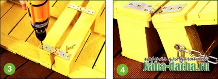 3. Аналогично выполняют подвижное соединение сиденья и подножной части, только петли устанавливают с изнаночной стороны. 4. Положение сиденья (выпрямленное или изогнутое) регулируют с помощью цепи. Ее подвешивают на шурупы 6 x 80 мм, которые крепят к ножкам палет.
