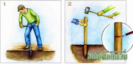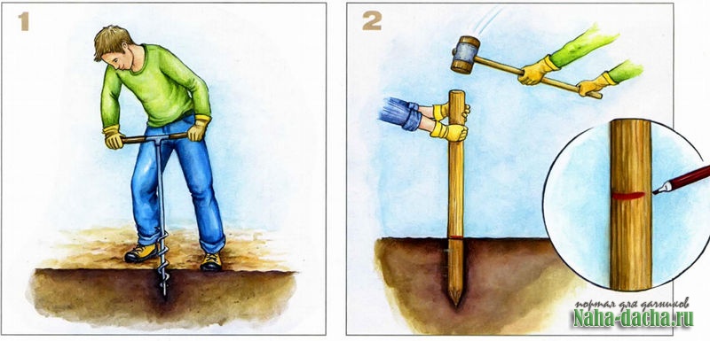 2. Вбивать в землю столбы желательно тяжелым деревянным молотком, тогда древесина не расщепится. Если у вас есть только обычный железный молоток, положите на столб доску и уже по ней стучите. Совет: мелом или карандашом отметьте, на сколько надо вбить стойки (минимум 30 см).