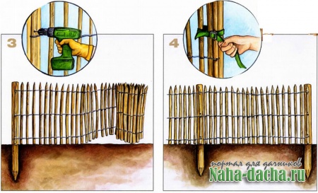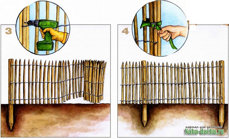 Штакетник своими руками 3. Сделайте штакетник - свяжите шесты между собой проволокой или крепкой веревкой. При этом штакетины вы можете крепить на небольшом расстоянии друг от друга или связывать их вплотную — это дело вкуса. Затем прикрепите штакетник к стойкам. Практичное и надежное решение — в нескольких местах просто привинтить штакетины к столбикам.