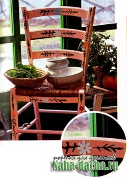 Модный прикид Нарядите стул в новую летнюю одежку. Для этого покрасьте его светлой краской и высушите. Затем вырежьте из цветного картона контуры любимых цветочков и приклейте их прозрачным клеем на деревянные детали стула, украсив листьями сурепки или укропа. Сверху для закрепления нанесите слой фиксирующего лака.