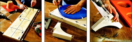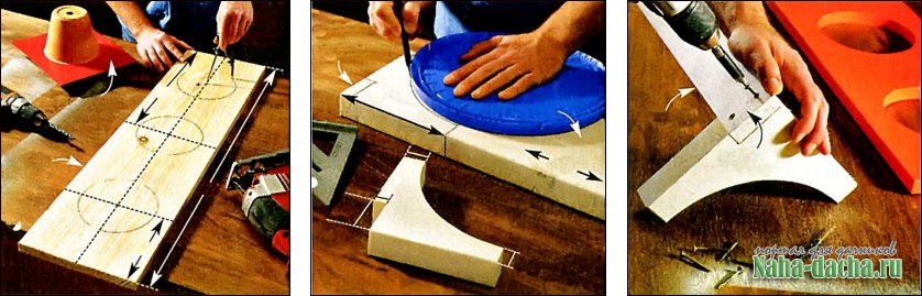 В полке вырезают отверстия под кашпо. Детали полки соединяют шурупами-саморезами. Покрасив полку, крепят её шурупами, ввернув их через спинку полки.