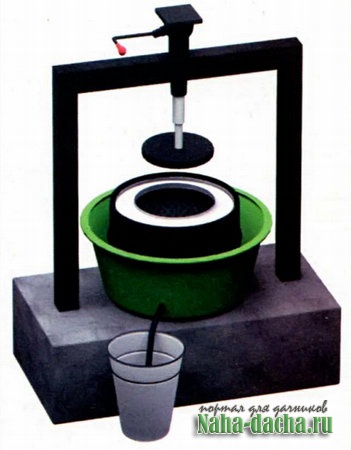 Чтобы рама прочно стояла «на ногах», забетонировал механизм на возвышении. Высоту возвышения подобрал так, чтобы под ним поместилось ведро, в которое сливаю сок. Когда пресс в работе, обе емкости ставлю в широкий пластмассовый таз, в днище которого просверлил отверстие и вставил туда трубочку. По ней сок и попадает в ведро.