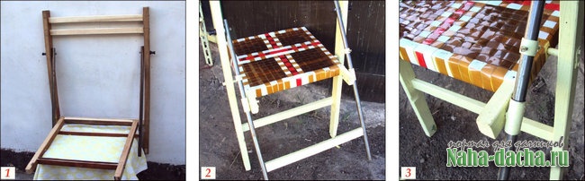 Складной механизм собрал из металлических опор длиной 610 мм и d 16 мм. Продел их в обрезки трубы большего диаметра, закрепленные шарнирно к выступающим спереди краям сиденья. Ограничители движения изготовил из более коротких отрезков трубы. Жестко закрепил их на металлических опорах стула, а их прикрутил болтами (подвижно) сверху к деревянной раме (фото 3). Сиденье обтянул лентой из ПВХ бутылок. Готово.