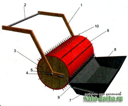 В доски вбил обычные гвозди, после чего шляпки у них откусил плоскогубцами. Можно сделать такой каток и из обычной железной бочки. Правда, зубья тогда надо будет приваривать к ней. На ковше нужно установить гребенку, которая будет снимать листья, ее можно сделать из старых грабель. Принцип работы катка прост -я иду сзади и толкаю его перед собой, листья и другой мусор цепляются зубьями и сбрасываются в ковш.