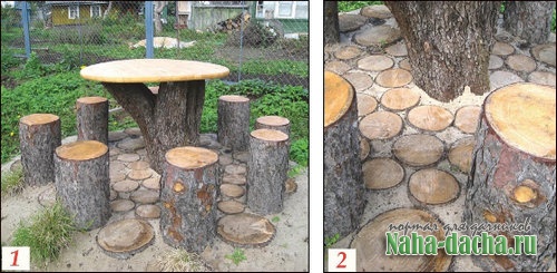 основании яблони закрепили столешницу. Распилили ствол другого дерева на чурки. Из них получились удобные «табуреточки». Пол между ними выложили из отдельных спилов, утрамбовав в толстый слой песка (фото 1, 2). Обложили это место по кругу кусочками дерна, чтобы избежать размывания песка во время дождей.
