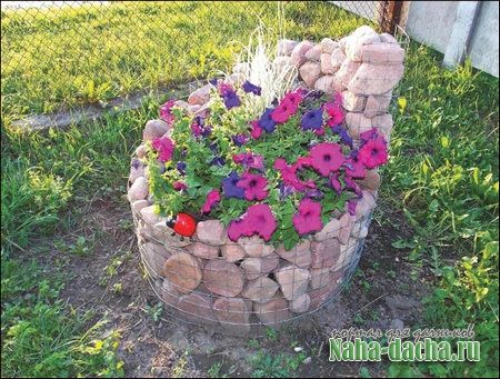 Уложили в сгенки каркаса камни (старались подбирать одного цвета) так. чтобы щели между ними были как можно меньше. Застелили внутри конструкцию черной плотной пленкой. Засыпали в нее грунт и высадили декоративные растения.