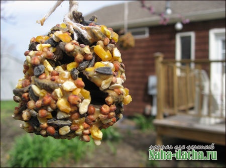 Взяла несколько еловых шишек покрупнее. Сверху прикрепила петельку из прочной суровой нитки. Густо обмазала шишки свиным жиром (можно использовать и маргарин). Затем обваляла шишки в семечках. Застывший жир их хорошо удерживает, и даже на морозе корм не обсыплется.