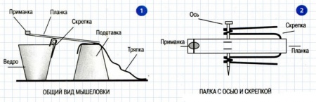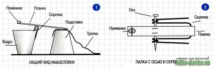 На левом конце планки закреплена приманка. Под правый конец планки установлена подставка (второе ведро, картонная коробка, охапка дров). На подставку накинута тряпка (мешковина, половик), по которой мыши легко поднимутся на подставку и по планке устремятся к приманке.