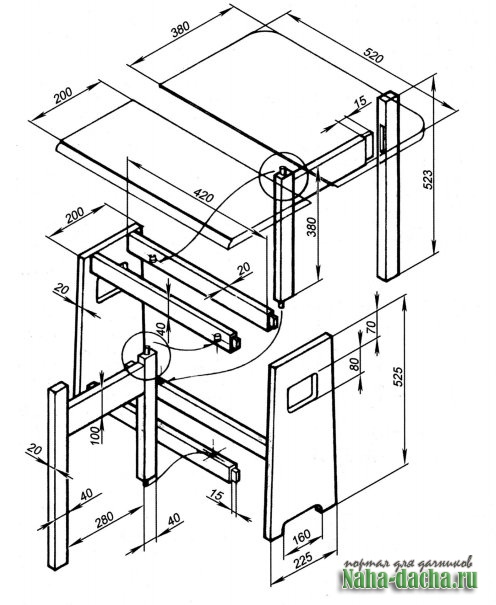 На концах перемычки (заготовки размерами 20x100x320 мм) выпилите шипы под пазы на ножке и стойке. Можно, конечно, обойтись и без этого, закрепив перемычку четырьмя саморезами. Получится менее эстетично, но проще.