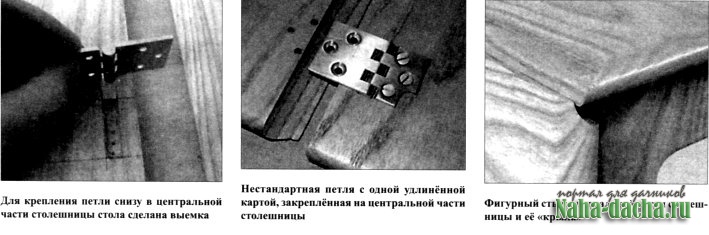 Как видите, процедура изготовления стыка довольно трудоёмкая и требующая не только дополнительных приспособпений, но и навыков. Поэтому, если не предъявлять жёстких требований к столу, можно поступить проще, отказавшись от фрезерования торцов в местах сочленения центральной секции столешницы и ее «крыльев». При этом достаточно будет обычных петепь, под которые не нужно будет делать выемки в центральной секции столешницы, но «крылья» будут заметно выступать за её габариты.