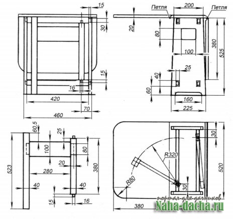 Стол-книжка своими рукамиСкпадные опоры состоят из ножки (заготовки размерами 25x40x523 мм), соединённой одной широкой перемычкой со стойкой (заготовки размерими 25x40x380 мм). Ножки должны быть на 2 мм короче боковин, чтобы свободно убираться под центральную часть столешницы. Для компенсации разницы в высоте, чтобы «крыпья» были горизонтальны, снизу к ним стоит прикрепить металлический упор-уголок с 2-мм стенками. Он не только исключит наклон, но и послужит упором для складных опор. Можно, конечно, сделать упор из дерева в виде бобышке, но это сложнее.
