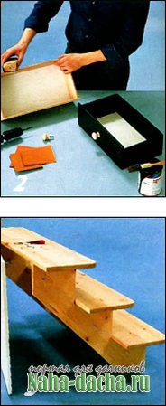 2. Выдвижные ящики собирают на клею и длинных тонких саморезах, исходя из размеров полости над полкой. Детали для ящиков выкраивают из толстой фанеры.