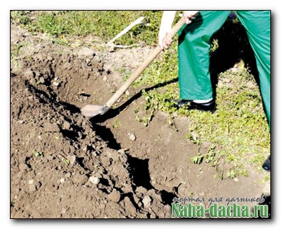 Сначала выкапываю неглубокий ров с края грядки (обычной лопатой). Затем при вскапывании моим приспособлением, пласты каждого нового ряда укладываются в углубление предыдущего.
