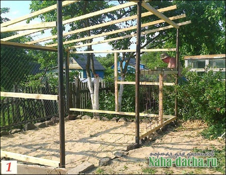 В качестве одной из стен беседки послужила секция имеющегося у нас забора из сетки-рабицы (размером 150x270 см), расположенная вблизи от дома. Из брусьев длиной 2 и 2,5 м решили возвести конструкцию неправильной формы. Тыльная стена (секция) — шириной 2,75 м, левая боковая часть — 2 м, правая — 2,5 м, передняя — 2 м, причем вход в беседку расположили наискосок. Шиферную крышу тоже спланировали сделать под наклоном.