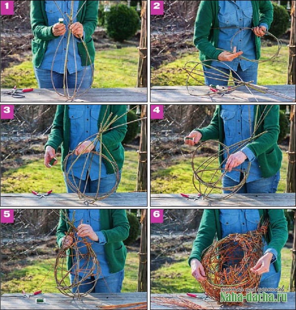Для этого нарежьте в лесу свежей лозы. Использовать ее нужно как можно быстрее (если не получилось, за пару дней до работы замочите прутья в воде - они набухнут и снова станут гибкими). Для работы вам понадобятся ивовые прутья, плоскогубцы, проволока и веревка.
